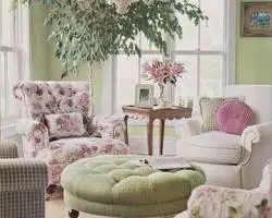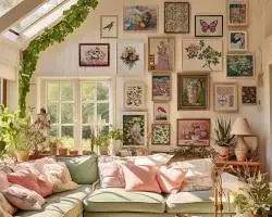 Create a cozy and inviting atmosphere with soft pink walls, floral patterned fabrics, and natural wood elements.