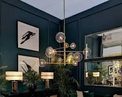 Add a touch of opulence with metallic accents, a shimmering pink sofa, and deep green velvet curtains.